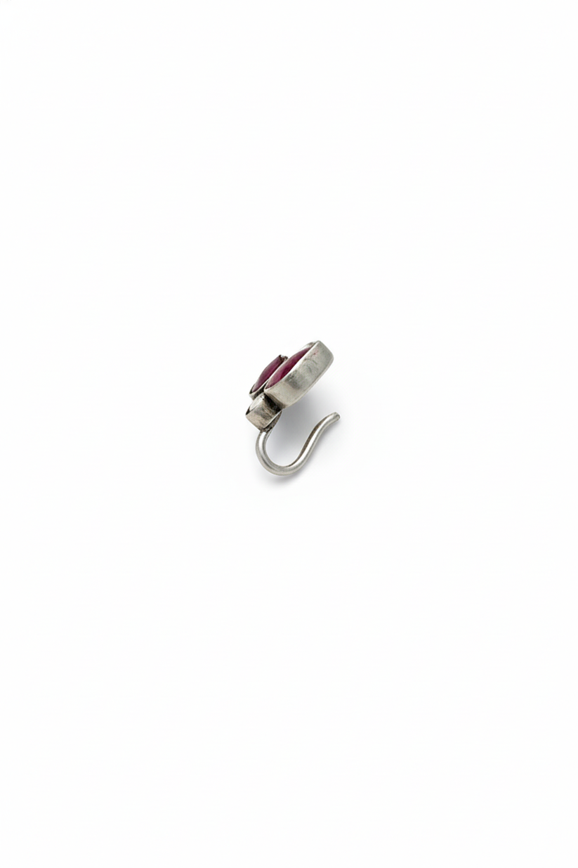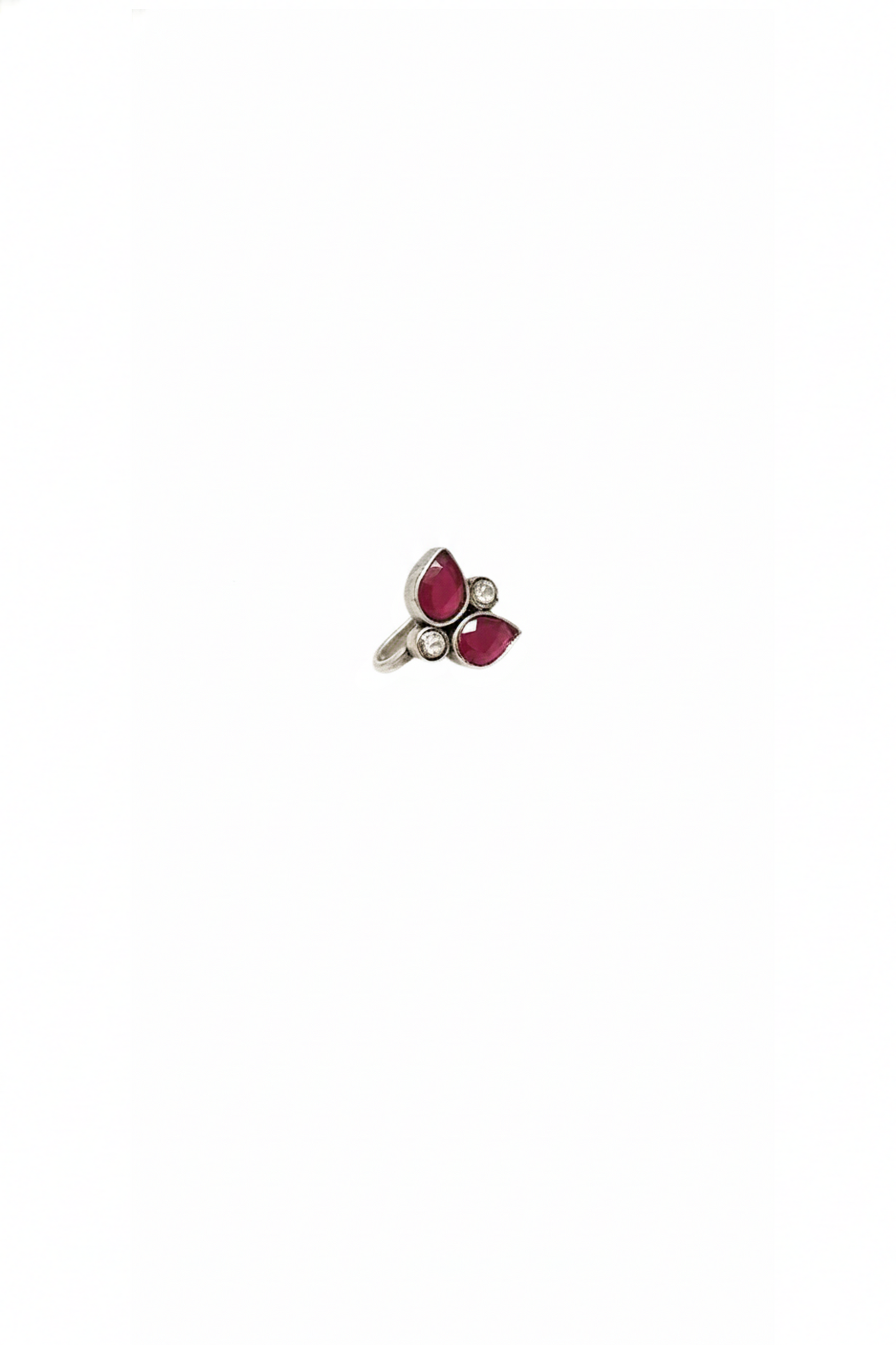 Elegant and delicately crafted, this press-on nosepin is made in 925 sterling silver with a charming floral-inspired design. It features two pear-shaped ruby-toned stones arranged like soft petals, beautifully accented with tiny round white stones for a subtle sparkle.