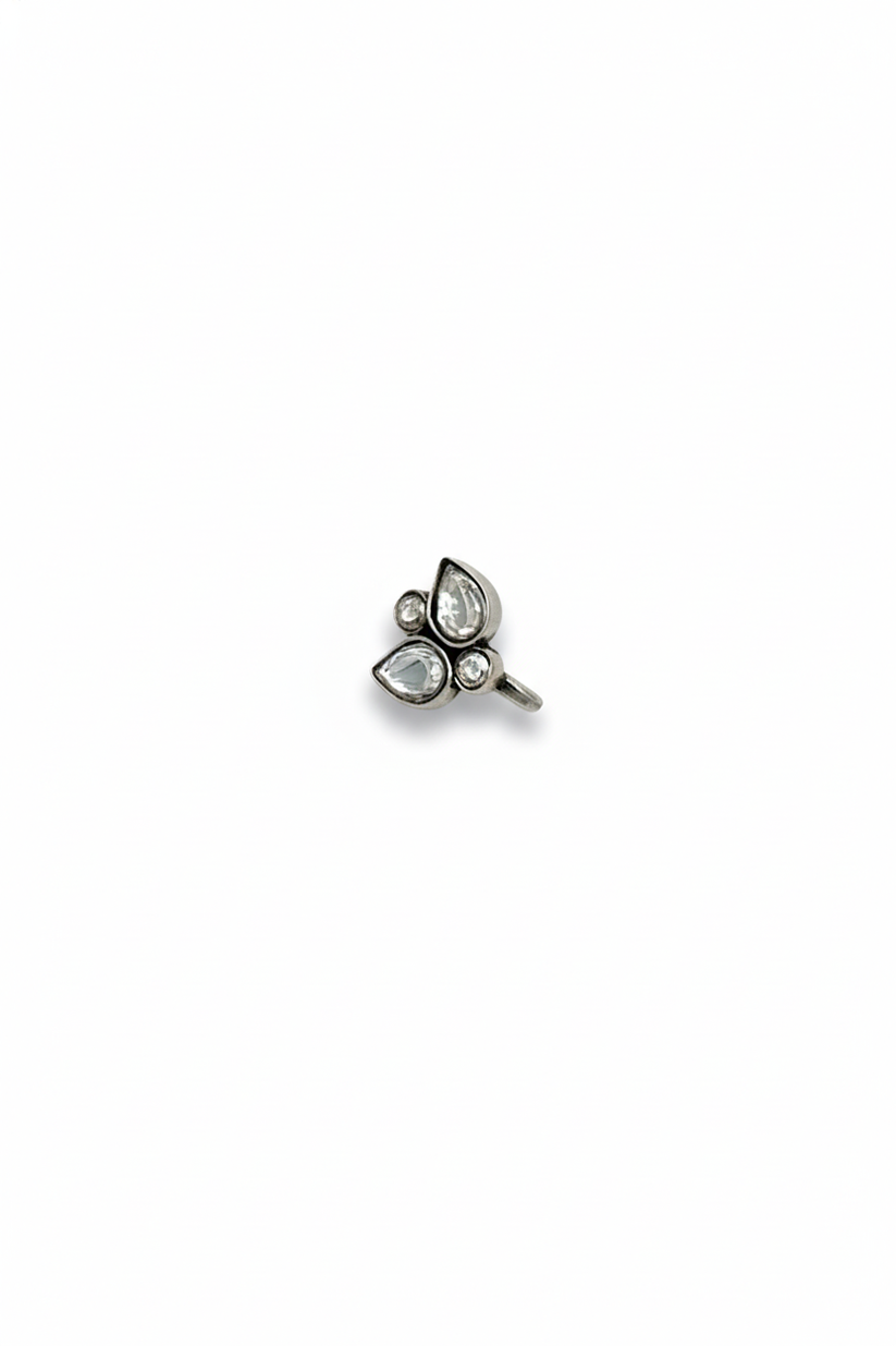 The cluster setting gives it a graceful, blooming look while maintaining a modern touch. Designed as a comfortable silver press-on nosepin, it sits securely without piercing.