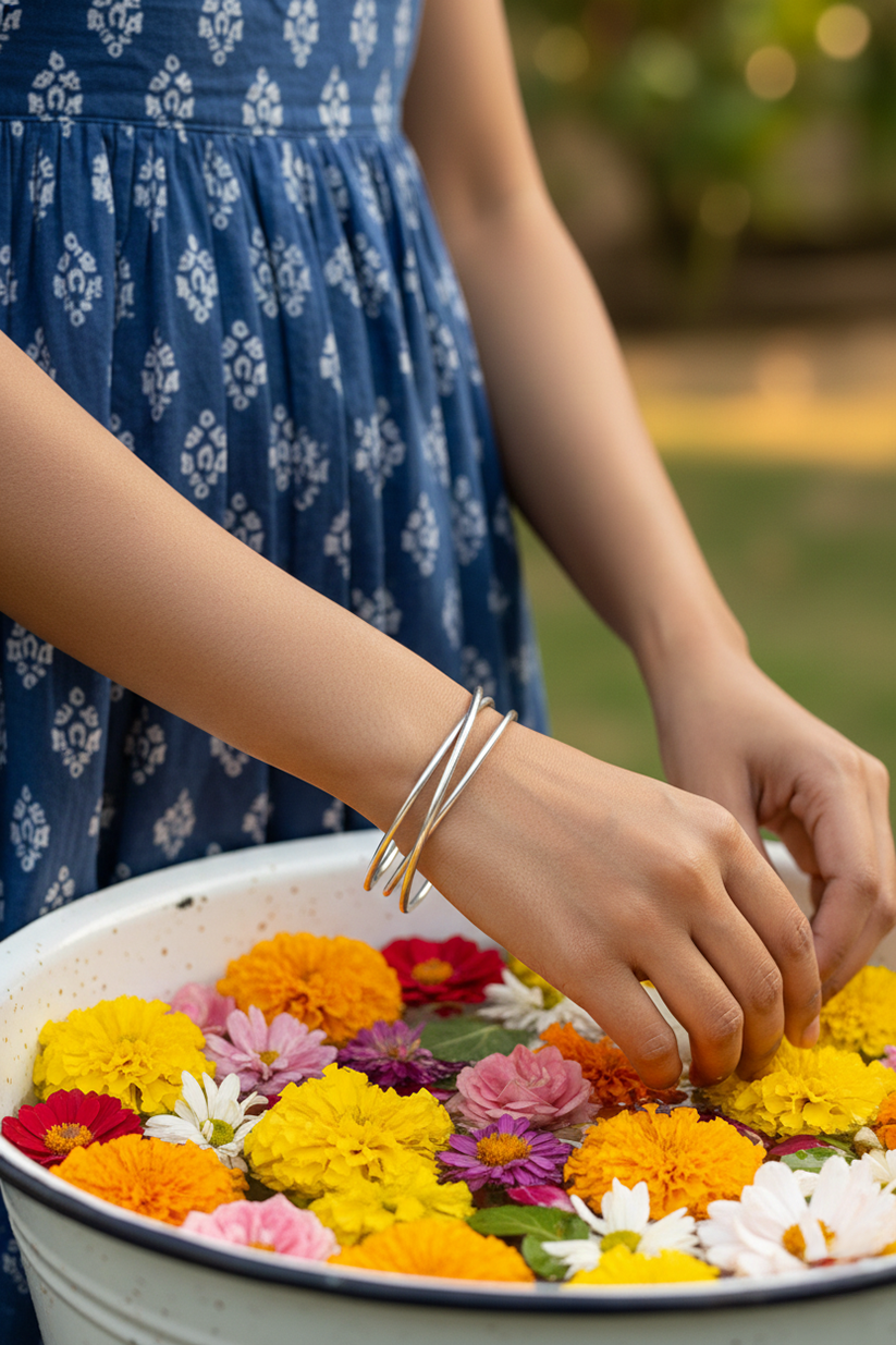 This sleek open cuff bangle is perfect for effortless layering—pair it with other delicate bracelets or wear it solo for a clean, minimal look. It complements both ethnic outfits like kurtis and sarees as well as modern styles such as dresses or co-ord sets. For a chic finish, match it with silver rings or small hoops to create a balanced, polished vibe.