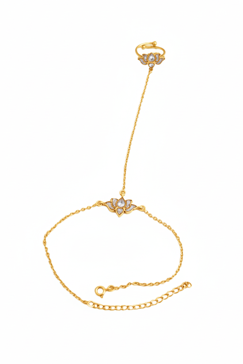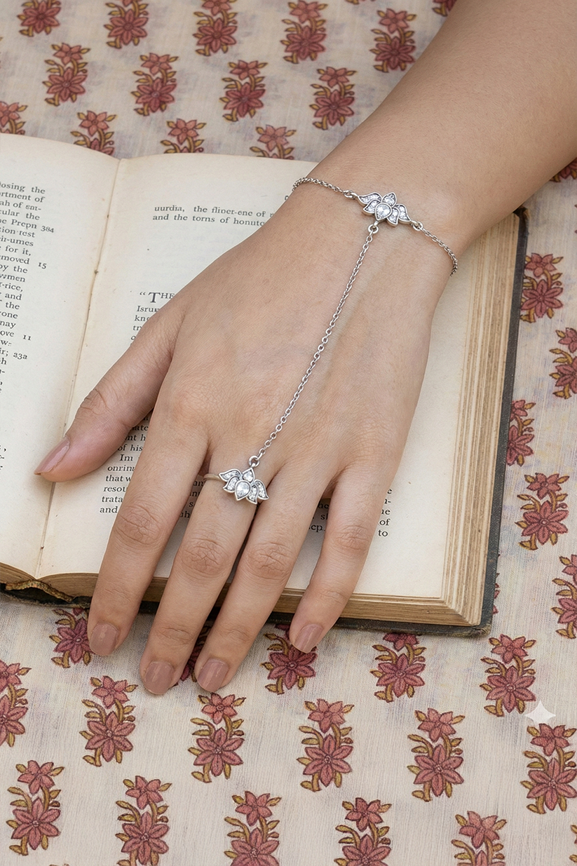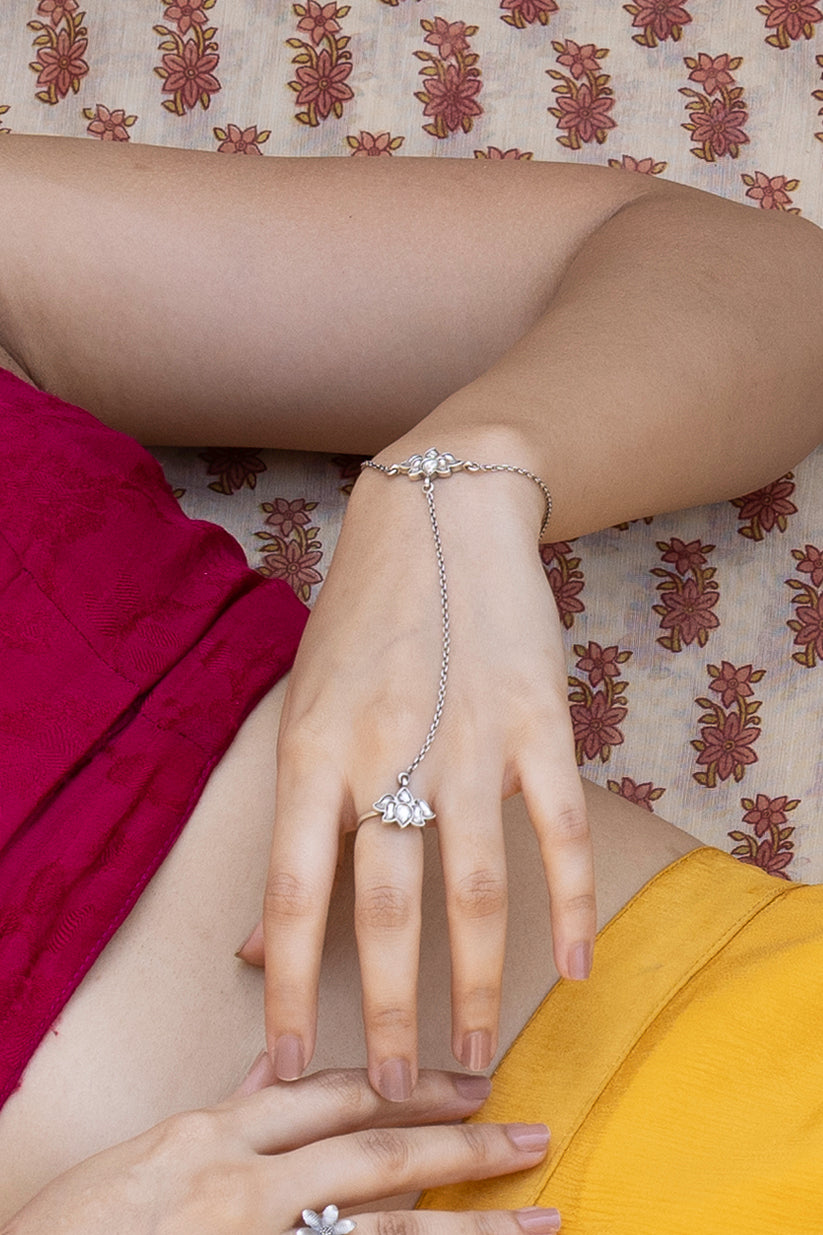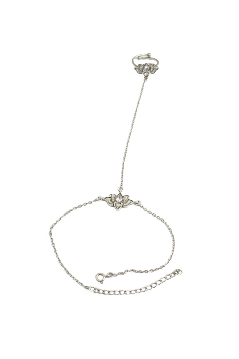 Celebrate timeless Indian elegance with the Kamala Rekha Hathphool, a graceful hand harness inspired by the sacred lotus motif. Crafted in 925 sterling silver, this hathphool features a delicately detailed lotus ring connected by a fine chain to a matching wrist bracelet, symbolizing purity, femininity, and divine beauty.