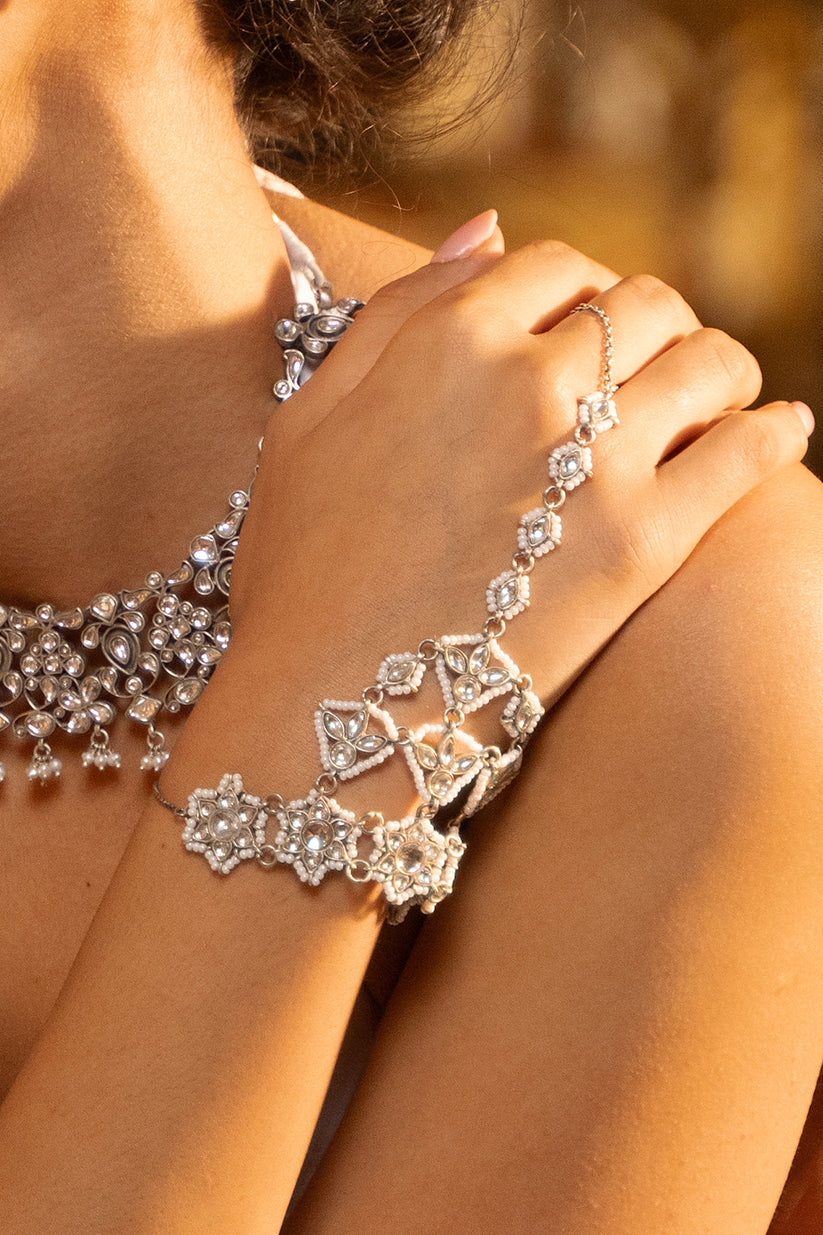 Handcrafted in 925 silver, this Chhavi Noorani Kundan Hathphool showcases meticulous craftsmanship through its layered floral lattice design and refined kundan-inspired accents. Each motif is carefully shaped to create balance, symmetry, and fluid movement across the hand. A timeless piece that blends traditional techniques with contemporary wearability, making it a treasured addition to any jewellery collection.