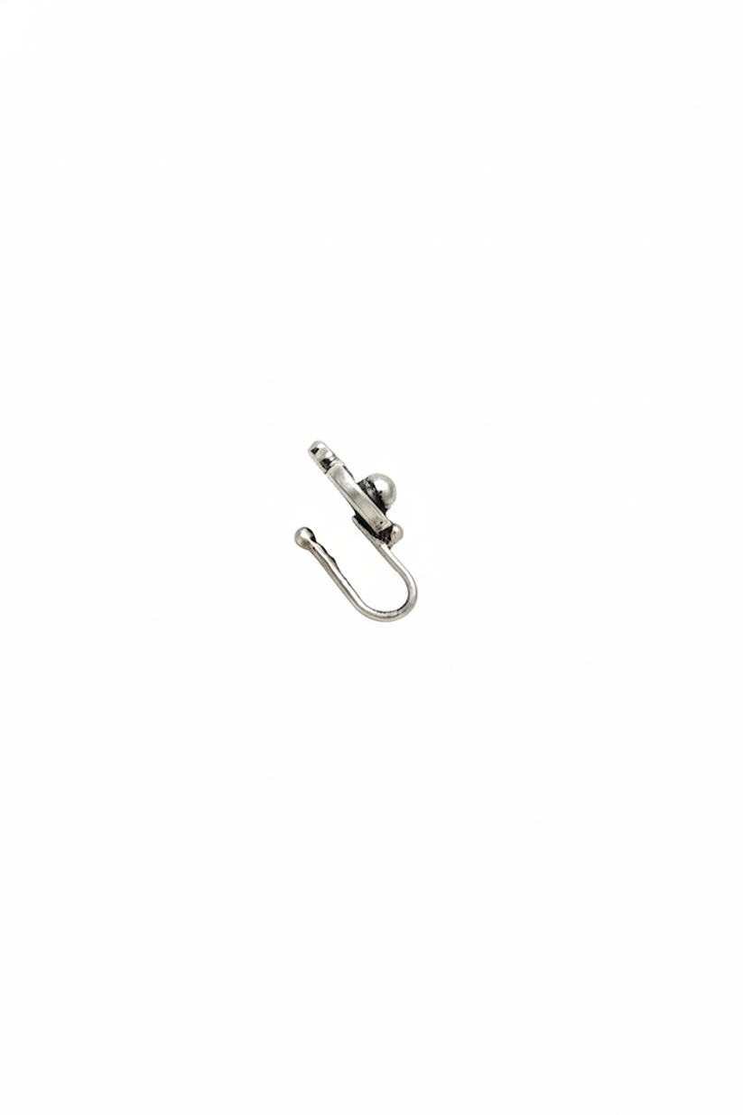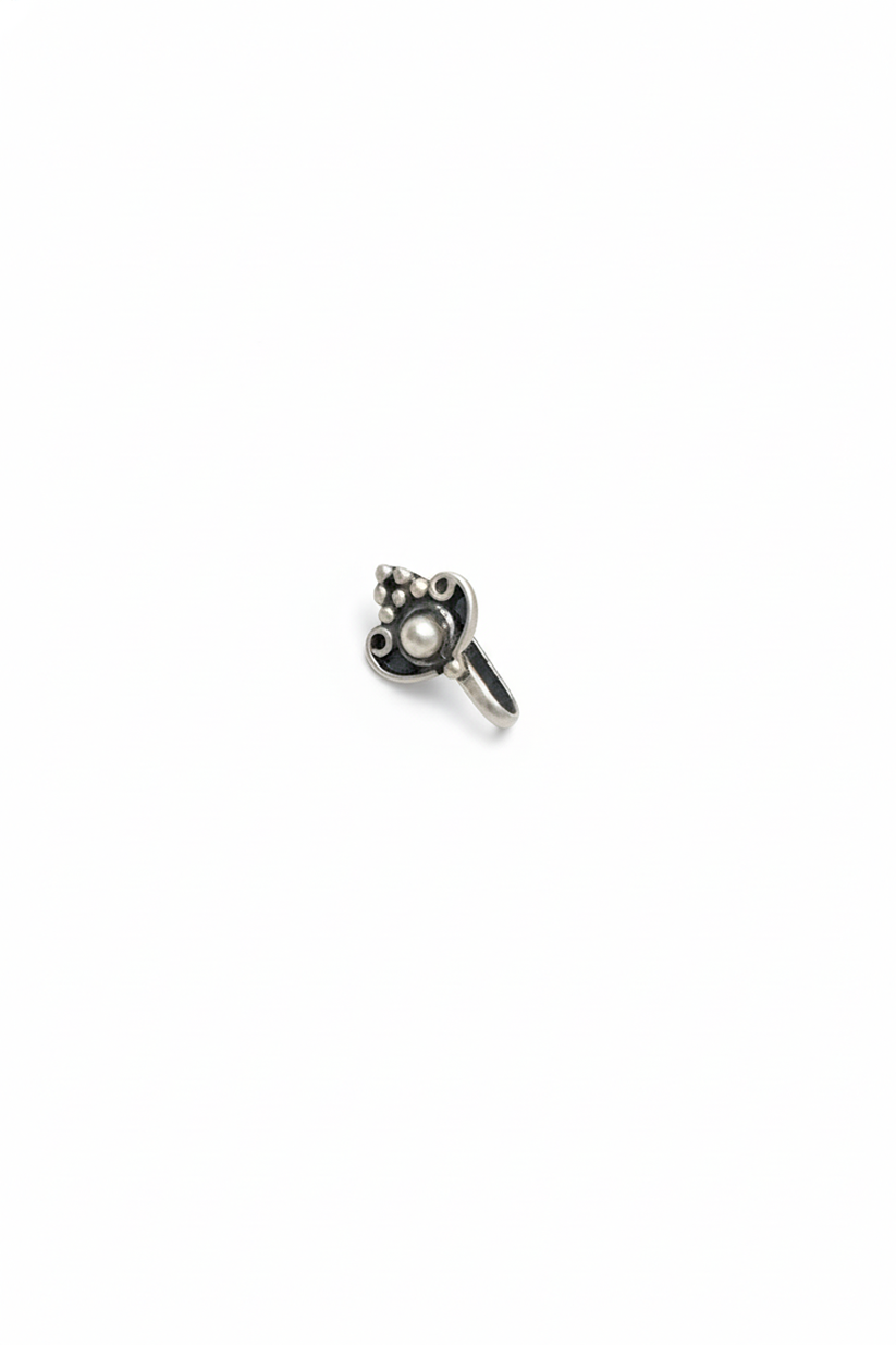 The Chhaya Anika Tribal Nose Pin is a small, beautifully crafted piece made from 925 silver. Its design is inspired by traditional tribal jewellery, with tiny silver dots and a smooth central bead that give it a handcrafted, earthy look.