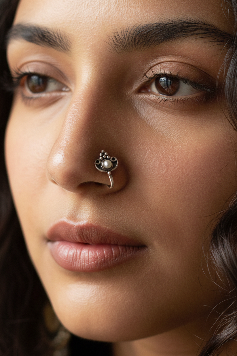 Pair the Chhaya Anika Tribal Nosepin with kohl-lined eyes and a soft matte base to highlight its bold tribal detailing.
