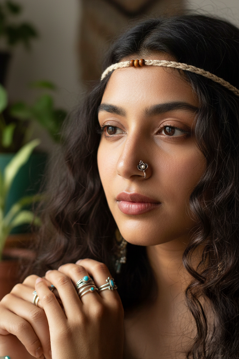 For a traditional vibe, style it with a cotton saree, oxidised jhumkas, and a low bun. For a modern Indo-western look, wear it with an oversized shirt, silver rings, and open hair.