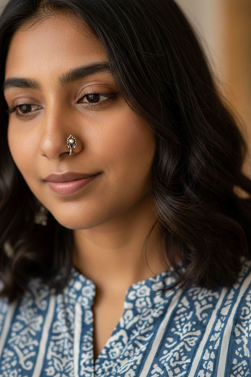Let this nosepin add a subtle traditional charm to your look. Pair it with soft kohl eyes and a nude lip for everyday elegance.