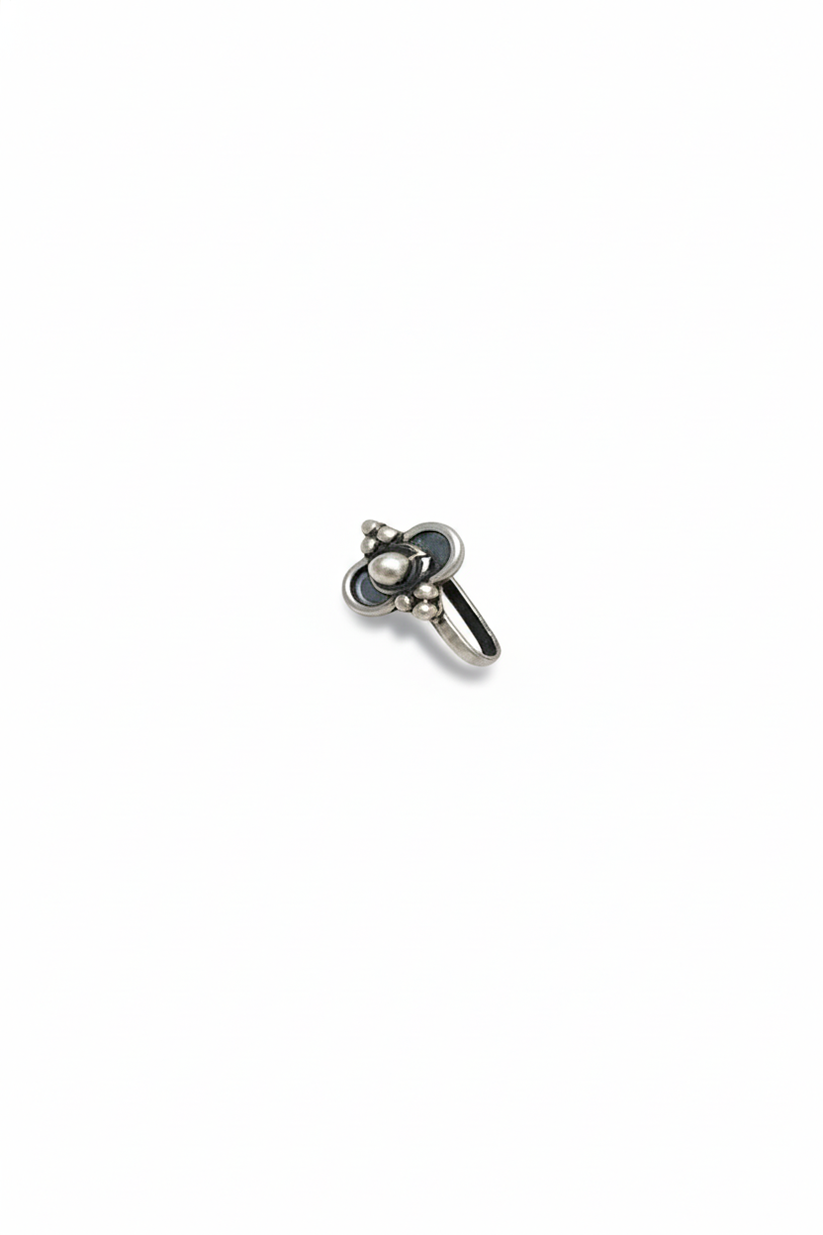 Handcrafted in 925 silver with an antique oxidized finish, this tiny nosepin features a delicate petal-shaped motif accented with fine silver bead detailing.