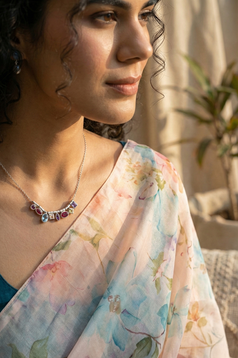 Let the Chokho Gemstones Mismatched Necklace be the star of your look by pairing it with a solid-colored outfit—think white shirts, black dresses, or pastel kurtas—to make the vibrant gemstones pop beautifully.