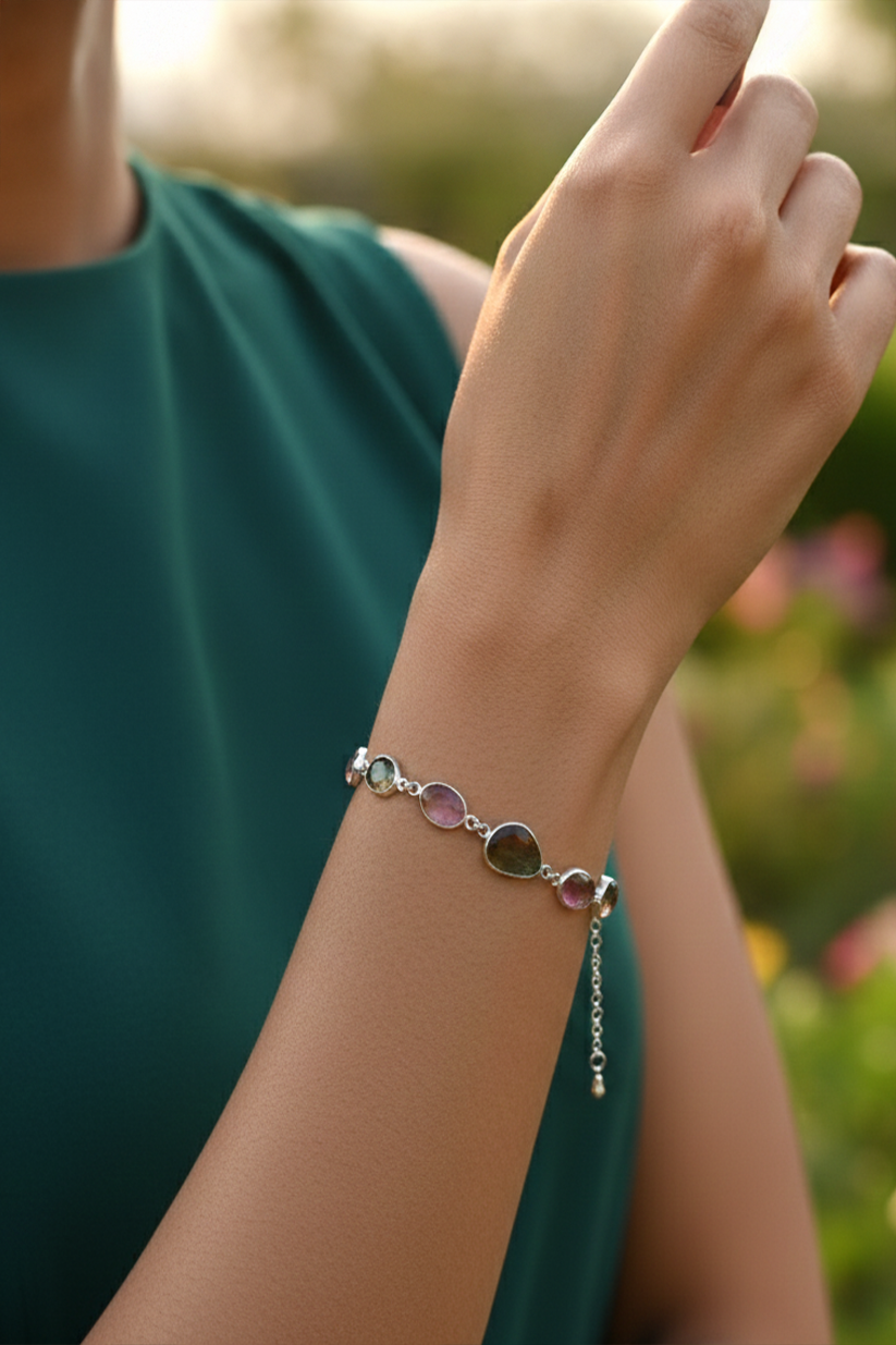 Dainty yet full of character, this 925 sterling silver bracelet honors the raw beauty of tourmaline, embracing its organic shapes and unique cuts, just as it celebrates your individuality.